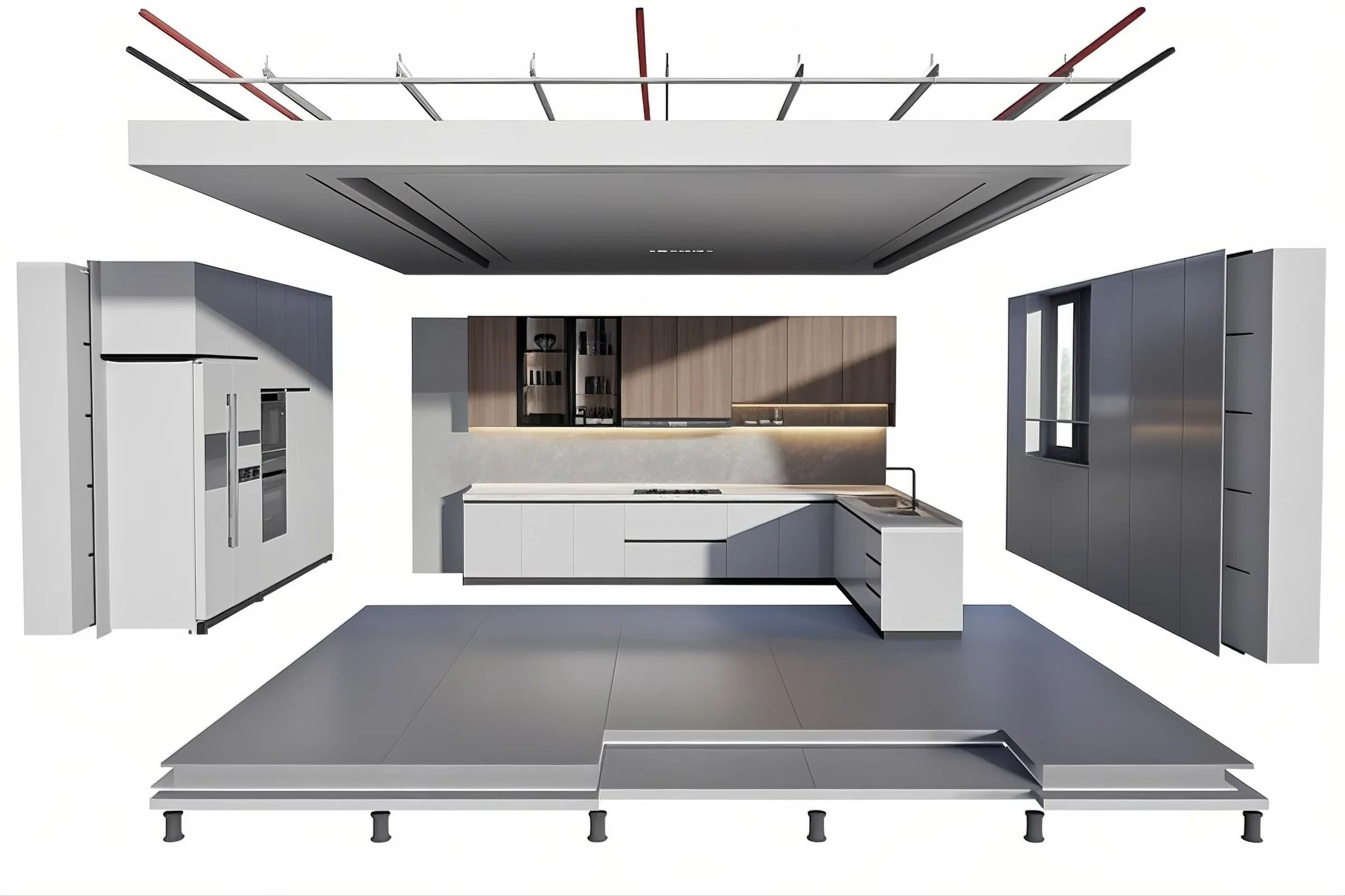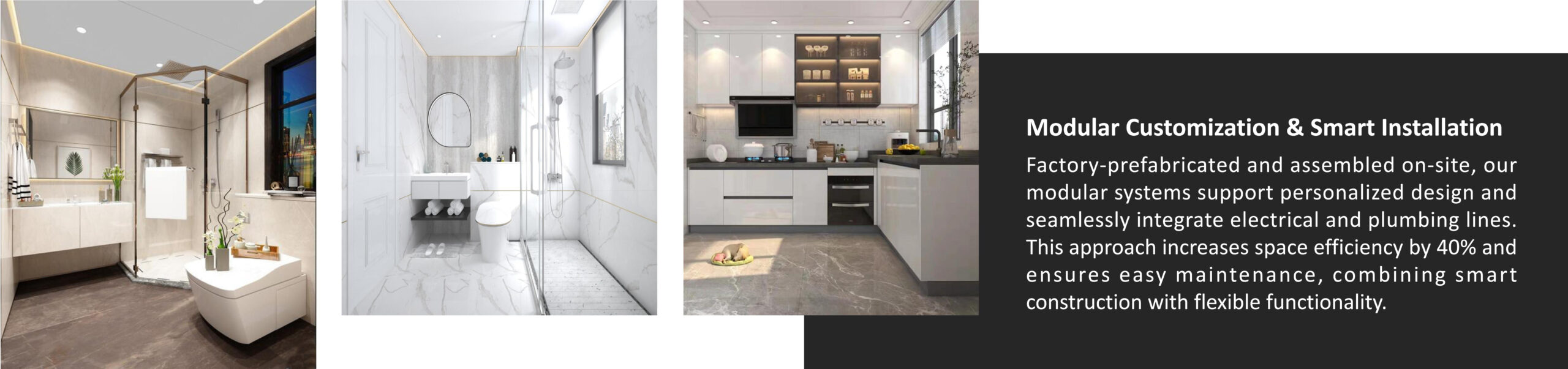 Our integrated kitchen and bathroom solutions are factory-prefabricated and assembled on-site, ensuring precision, efficiency, and quality control. The integrated kitchen combines cabinetry, appliances, and piping into a unified system, allowing for rapid installation and optimal space utilization. The integrated bathroom features a seamless waterproof base, wall, and ceiling structure, delivering true dry-wet separation and eliminating leakage risks.