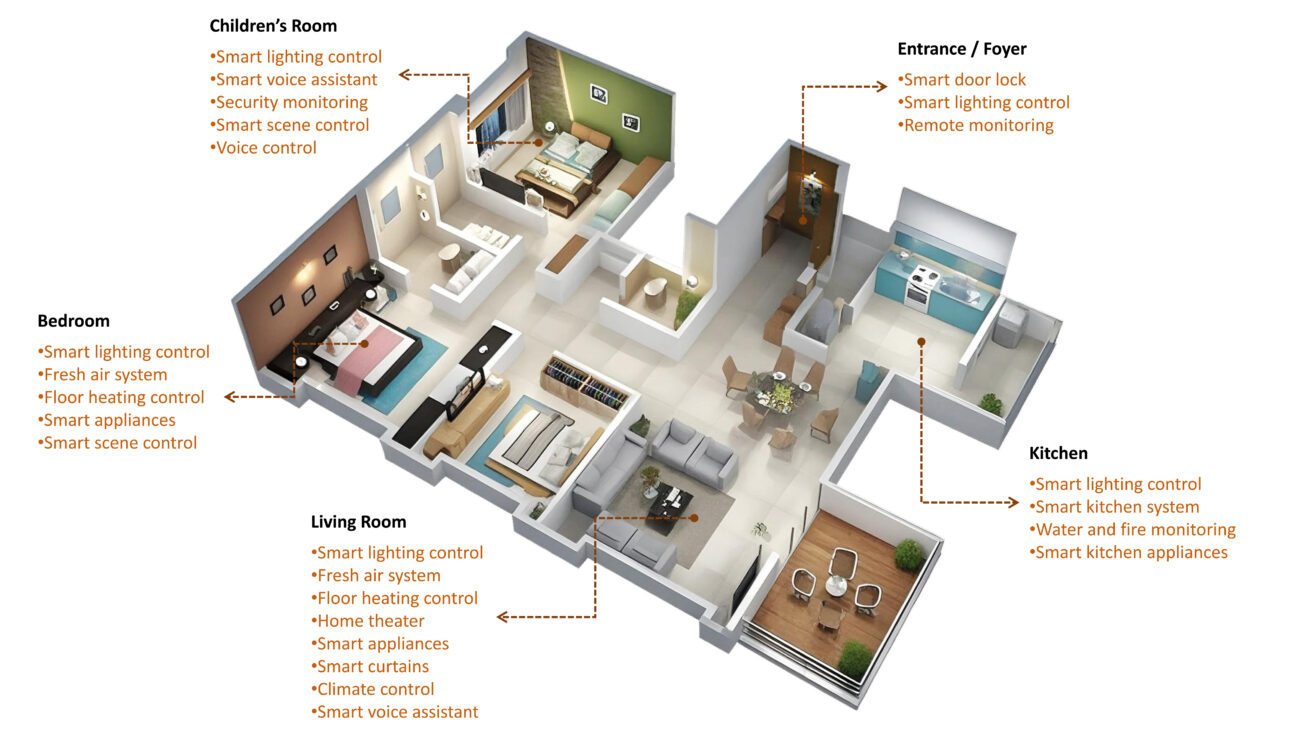 The integrated smart home system connects all devices throughout the house to enable voice and remote control, intelligent security, energy optimization, and adaptive scene settings—enhancing convenience, safety, and overall quality of life.